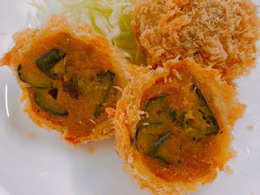 カボチャのひとくちコロッケ おやつにしてもいい優しい甘さのコロッケ <材料> かぼちゃ 1/2個(約500g)調味料☆砂糖 大3~4☆醤油 大2☆顆粒だし 小1水 500ccパン粉 適宜油(揚げ用) <作り方> ①かぼちゃは、綿や種を取り、3cm位の角にカットする。 皮の部分は、適当に切り落とす。②鍋に調味料と①を入れて、中火で煮る。(中火は煮くずれしにくい)③②をくずして、丸い形に成形し、パン粉をつけて 油で揚げて、出来上がり。
