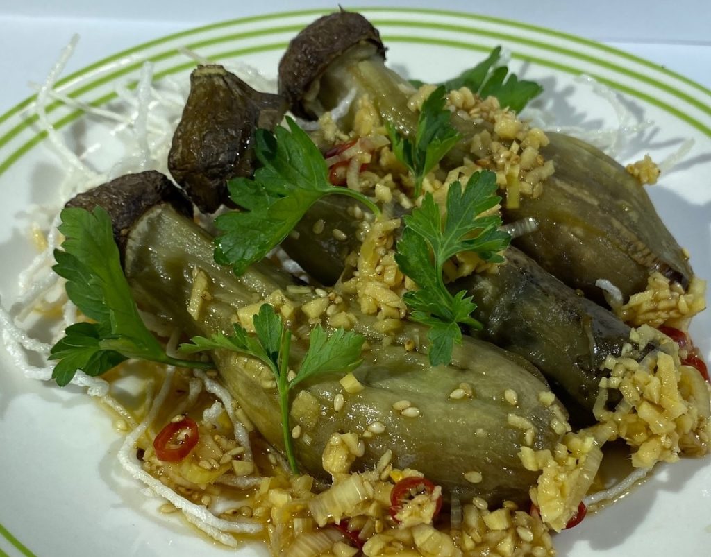 韓国風煮びたし ジュワーと胡麻油の香りが広がる、メインにもなる一品 <材料> 材料なす 4~6個パクチー 揚げた春雨 適量※乾燥春雨を素揚げにしたもの調味料☆醤油 大1☆白いりごま 小1☆ごま油 小1☆唐辛子 少々☆酢または黒酢 小1弱☆レモン汁 小1弱 <作り方> ①グリルでナスを丸ごと焼いて、熱いうちに皮をむく。※やけどに注意②☆調味料を合わせる。③あげた春雨を下にひき、①を盛り付け、②をかける。 お好みでパクチーを添えて、出来上がり。